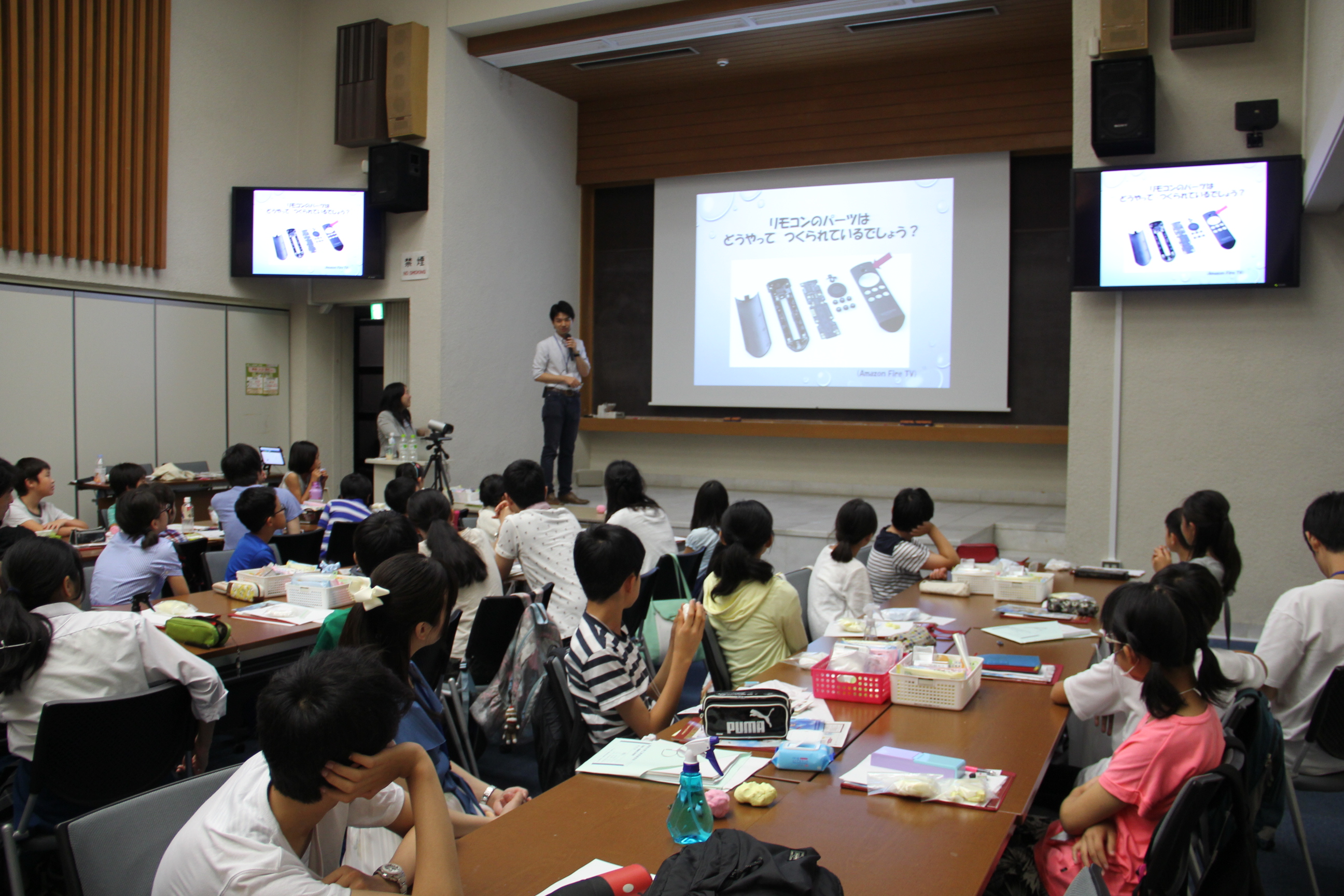 Next, Prof. Nagato gave us the lecture about manufacturing. He also gave us quizzes about manufacturing. In the lecture, he demonstrated and let us the experiments about deformation of object using clay. The students enjoyed the experiments. Although Prof. Nakagawa and Assoc. Prof, Nagato taught them advanced topics, they explained those principles easy to understand for kids. From this experience, I learned how to present my research to those who have no background knowledge on the topics. To do that, I should consider them to make them understand when I make a presentation. 次に、機械工学専攻の長藤准教授にものづくりについての講義をしていただきました。ものづくりとは何か、クイズ等を交えわかりやすく説明してくださいました。講義の中では、粘土を用いて物体の変形のメカニズムを知る実験も行われました。子供達も楽しそうに取り組んでいました。中川教授、長藤准教授ともに高度な内容であるにも関わらず、子供達にわかりやすく噛み砕いて説明されていて、自身の研究を予備知識のない他者に伝える際の参考となりました。