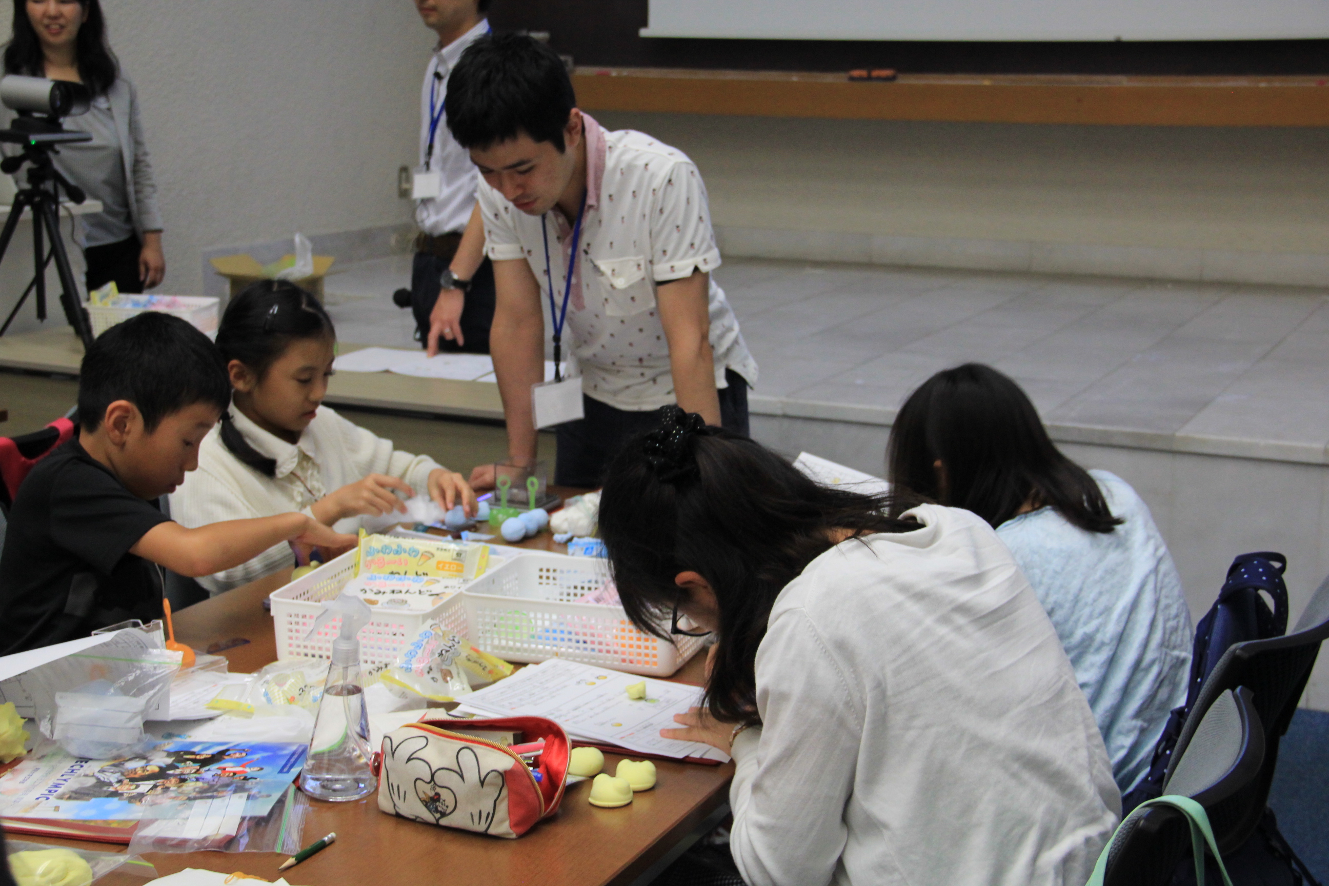 We as students supported the children in the workshops and experiments. Actually, we students previously held a rehearsal. We felt that some procedures were difficult. Thanks to that, we predicted the processes that were difficult for children and supported them well. I felt that I could make use of this experience when I made presentation about my study. I should predict points that are difficult for listeners. 私たち学生は中川教授と長藤准教授の行ったワークショップ及び実験で子どもたちの手伝いをしました。実は、私たちは別の日に一度作業のリハーサルを行っていました。リハーサルで私たち自身もつまずいた部分もあり、本番では子供達がつまずくかもしれない手順を予想して対処することができました。この経験は、相手が疑問に思うポイントを予想しておくという点で、研究内容のプレゼンテーションをつくる際に活きると感じました。