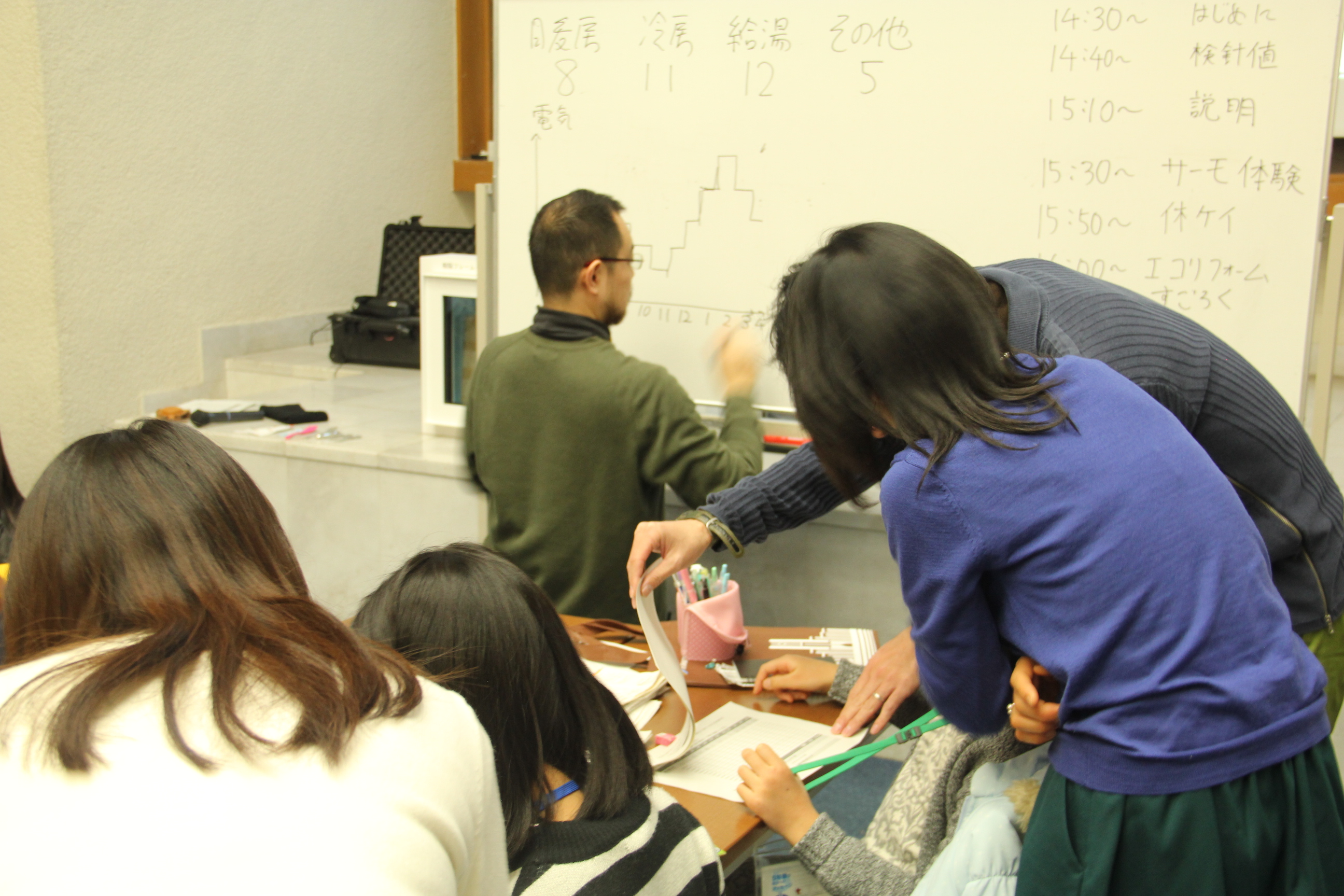 前半の講義の中では、参加者が各自持参した検針票を用いて、自宅の暖房や冷房、給湯や照明のエネルギー消費量を親子で調べるワークショップも行なわれました。はじめに参加者の親子に、どれに1番エネルギーを使っているか予想を聞き、検針票から割り出した実際の状況との比較をすることで、自宅のエネルギー使用の現状を理解してもらいました。