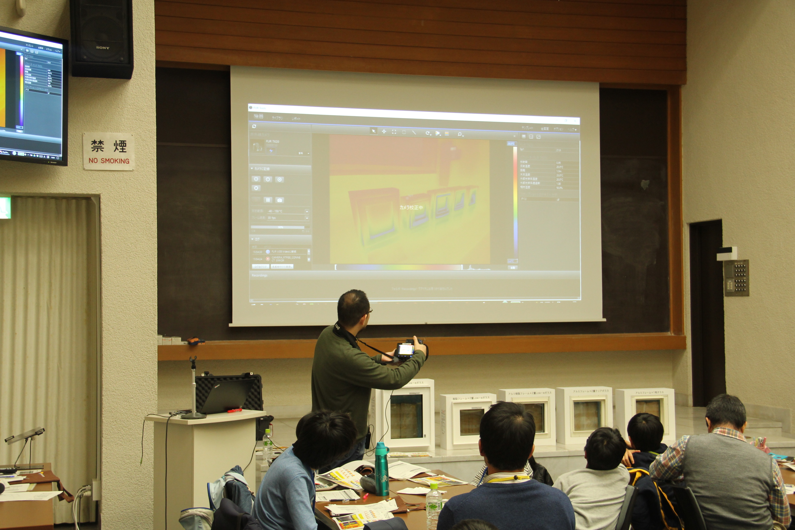 また、住宅の中で最大の熱的な弱点の1つである窓の性能の違いを確認するために、予めドライアイスを中に入れておいた規格の異なる5つの窓の表面温度を、サーモカメラを用いて計測しました。窓のサッシの素材はアルミとプラスチックに大別されますが、それぞれの温度差を、実際に窓に触って確かめてもらうこともしました。