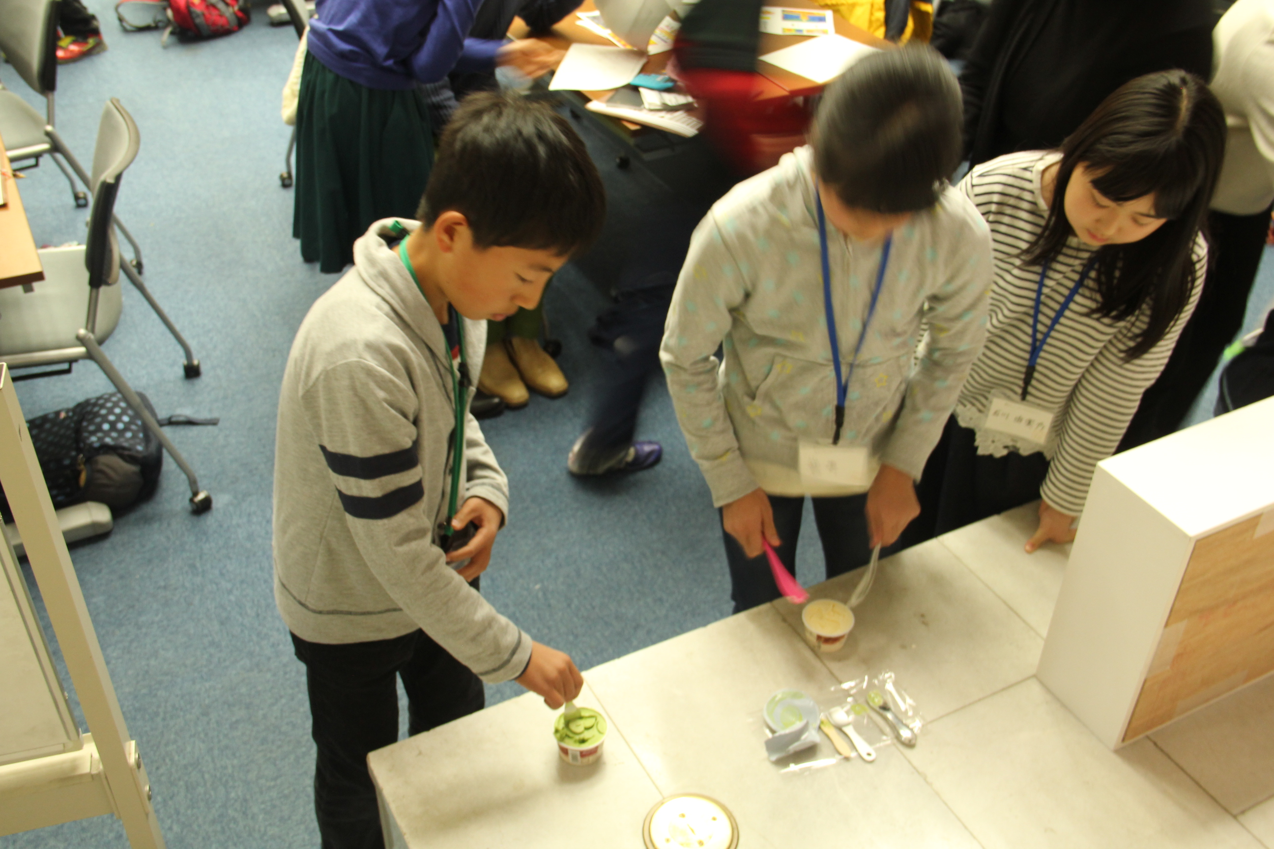 また、アルミとプラスチックの熱伝導率の差を理解するために、ハーゲンダッツを用いた簡単な実験も行いました。固く凍らせたアイスに、熱伝導率の低いプラスチックのスプーンは刺さらない一方で、熱伝導率の高いアルミのスプーンは体温が伝わるために刺さること披露しました。