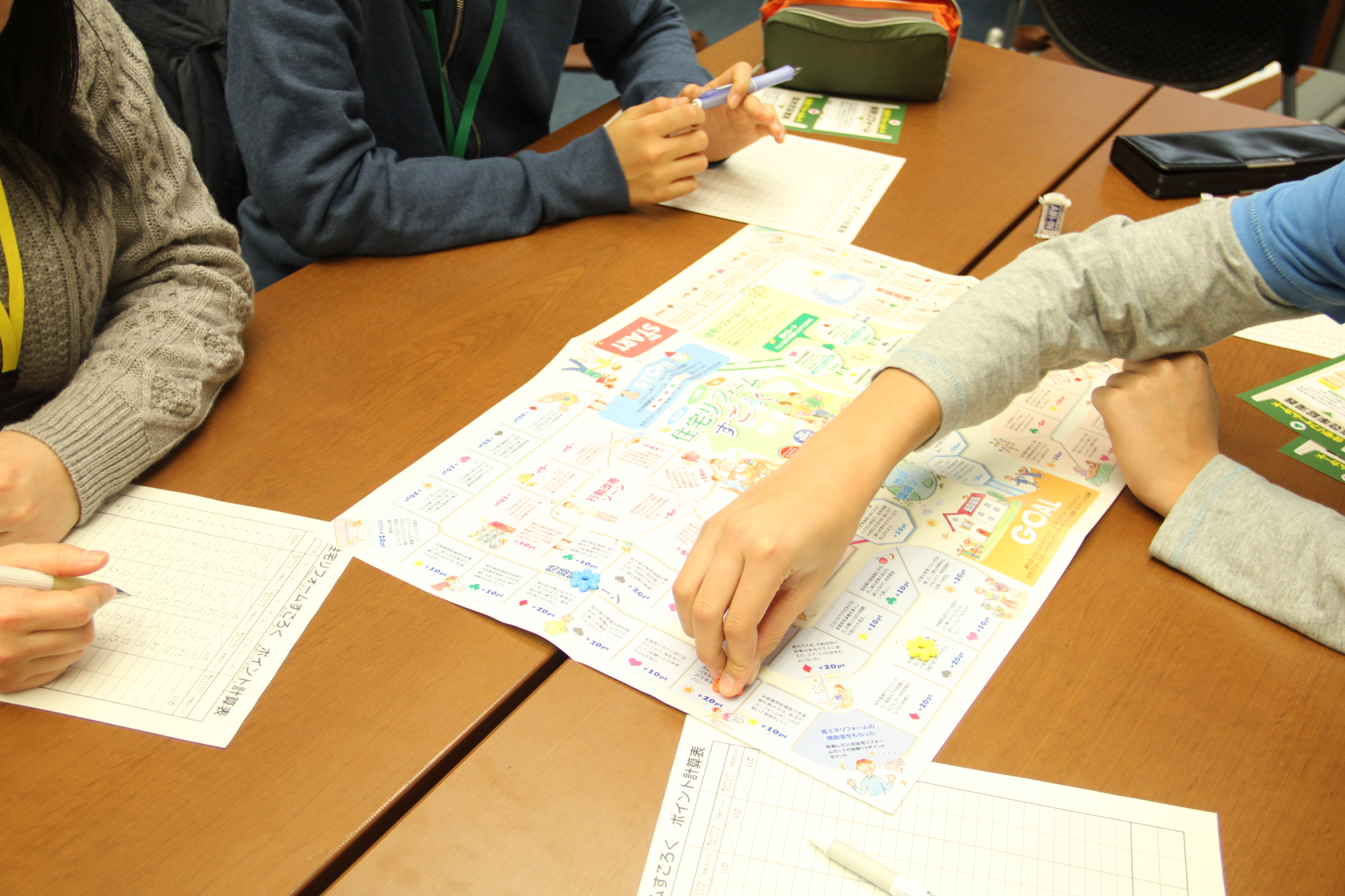 後半のすごろくには、それぞれのますに住宅の現状の問題点やそのリフォーム方法、改善例などが書かれており、止まったますの文を読み上げながら遊ぶことで、住宅性能の改善法を楽しみながら学びました。すごろくをする子供達はとても楽しそうでした。