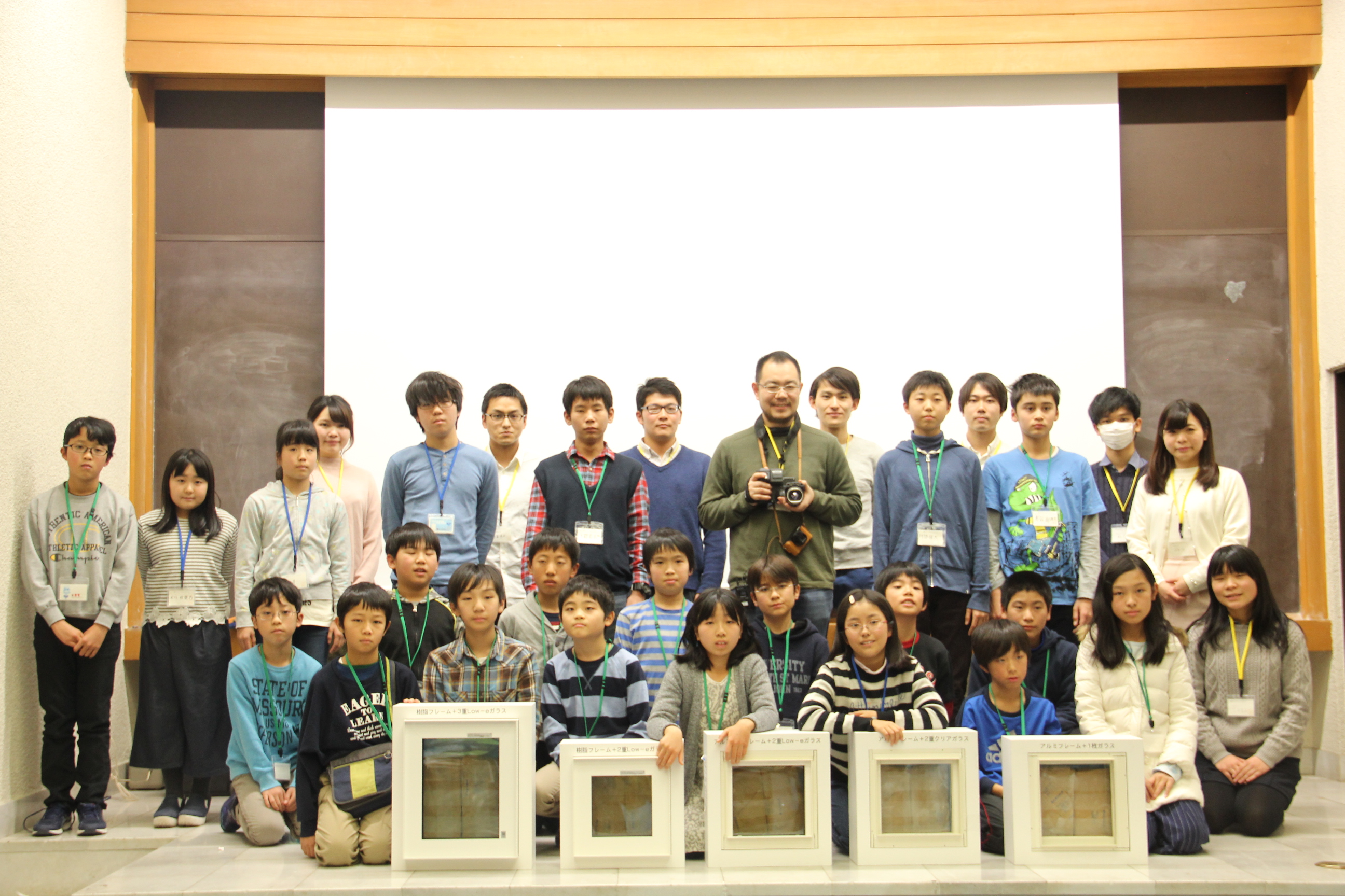 In addition, Mr. Mae showed the difference in the surface temperature distribution of five windows with different performance and property, in which were dry ice put in advance, by using a thermo camera, because windows are the greatest weakness when it comes to thermal insulation of buildings. The window frames are made of either aluminum or plastic. The students checked the surface temperature difference by actually toughing the windows, too.