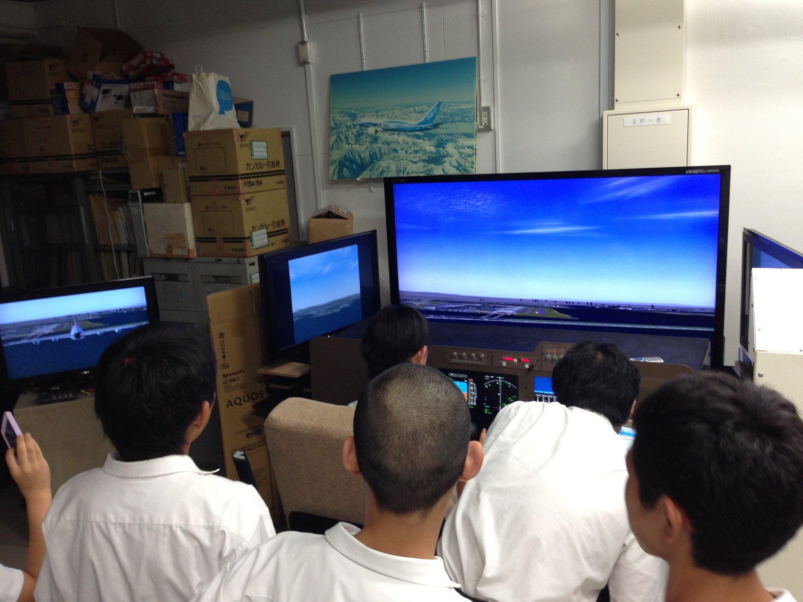 We visited Suzuki-Tsuchiya lab in Department of Aeronautics and Astronautics at first. The lab studies automatic control of airplane and so on. In this time, we experienced “flight simulator” which simulates controlling an airplane. We can see a view from cockpit on displays, and its control stick was quite similar to the real one. Boeing 747 landing was assumed, but most of the high school students’ airplane failed to land and clashed into the ground. However, they were watching the displays with their eyes shining and I thought they understood the difficulty of controlling an airplane with much enjoyment. 最初に訪れたのは航空宇宙工学専攻の鈴木・土屋研究室です。同研究室では航空機の自動制御などを研究しています。今回は飛行機の操縦をシミュレーションできる「フライトシミュレーター」を体験させていただきました。複数のディスプレイにコックピットからの景色が映し出され、操縦桿もリアルです。ボーイング747の着陸のという設定でしたが、ほとんどの生徒の飛行機はうまく着陸できずに地面に激突…。それにもかかわらず生徒は目を輝かせながら画面に見入っていて、飛行機の操縦の難しさを楽しみながら体験できたようでした。