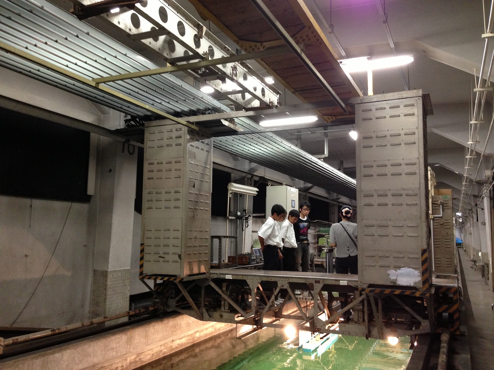 After that, we visited the experimental tank. The experimental tank, which belongs to Miyata-Akimoto-Tanaka lab, has a length of 90m (4 times as long as 25m swimming pool!). The lab studies designing shapes of ships using this experimental tank. The high school students were very surprised to see such large-scale experimental facility. After seeing the tank, the member of the lab explained their theme of research. They talked about topics in a broad range of fields for not only designing ships shape but something related to oceanography. The high school students were very interested in them and some students questioned actively. 次に私たちは船形試験水槽に向かいました。船形試験水槽とはシステム創生学専攻の宮田・秋元・田中研究室が管理する長さ90mもある水槽です(なんと25mプールの4倍近く)。同研究室ではこの水槽を使って船形設計などの研究をされています。この水槽を実際に見た生徒たちは実験設備の想像以上のスケールに圧倒されているようでした。水槽見学の後は学生が各々の研究テーマについて説明してくださいました。船舶設計に限らず海洋に関する幅広い分野を研究しているそうで高校生も関心が高く、積極的に質問する生徒も見られました。