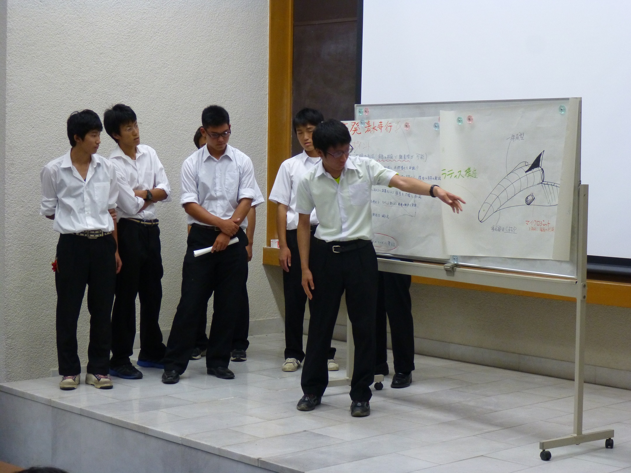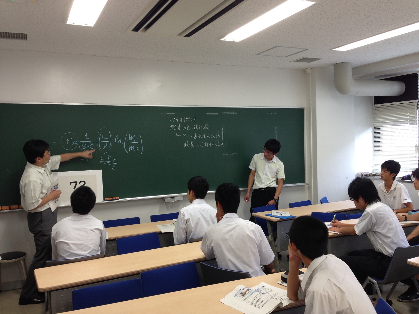 In the process of the presentation after the discussion, the students actively asked questions each other and some of them were extremely ingoing, like “How much does your aircraft cost?” However, what I found most striking was the comment by Professor Himeno after all the presentations finished. Some students had said that all the problems would be totally solved simultaneously in the future, but Professor Himeno told them that it would be really challenging to solve the problems at one time because they often conflict each other, and because of the trade-offs researchers and technicians had to struggle to balance the problems and to realize the idealized situations. This kind of comment from a professional who is actually struggling to solve conflicting problems must be very precious and beneficial to the students who were trying to build up some specific images of the research and the technology in the society. 発表では、「その航空機の値段は?」など、鋭い質問が生徒からたくさん出ていたことにも驚かされましたが、個人的に最も印象的だったのは、すべての発表が終わったあとの姫野先生の言葉です。「未来の理想の航空機ではすべての問題はうまく解決されている」という生徒達の発表に対して、「実際にはすべての問題をうまく解決することは難しく、現場の研究者たちは問題のトレードオフをうまくとりながら、どうすれば『すべての問題をうまく解決する』ことができるかを一生懸命考えている」という旨のコメントをしていたと記憶しています。生徒達が研究や社会に対して具体的なイメージを抱く中で、研究の現場にいる方だからこそできるそういったコメントはとても貴重で有益だったのではないでしょうか。