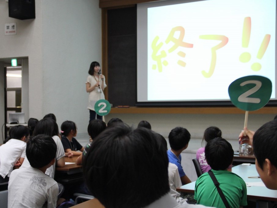 Finally, group-work workshop was held by university students. Children were divided into 6 groups, and they had fun answering quizzes about batteries and also making batteries themselves.