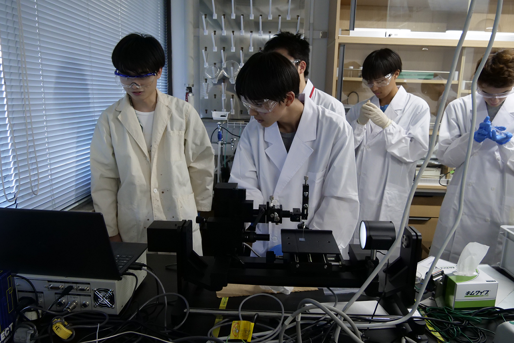 参加した高校生たちは、フッ素系材料の性質や測定原理についての講義を受けた後、実際にフッ素系ポリマーの成膜と接触角の測定を行いました。そのあと、両研究室の見学を行い実験設備や測定機器の説明を受けました。