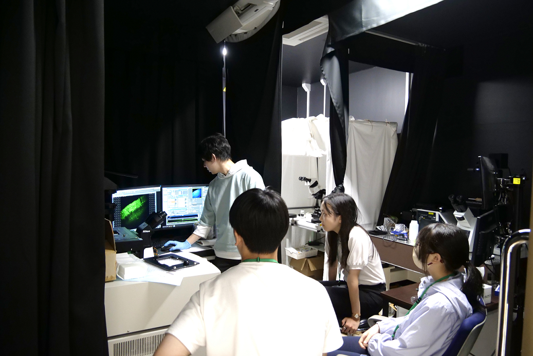In the Neurobiology Lab, we observed responses to synaptic stimuli within neurons which express fluorescent sensors for calcium ions and glutamate. Utilizing a high-speed fluorescence microscope, we monitored real-time changes in fluorescence intensity in neurons upon electrical and chemical stimulation, as well as the intricate neural circuits formed on a glass plate. The participants were surprised at the rapid propagation of neural activity, and how the morphology of organelles was much different from what is depicted in textbooks.