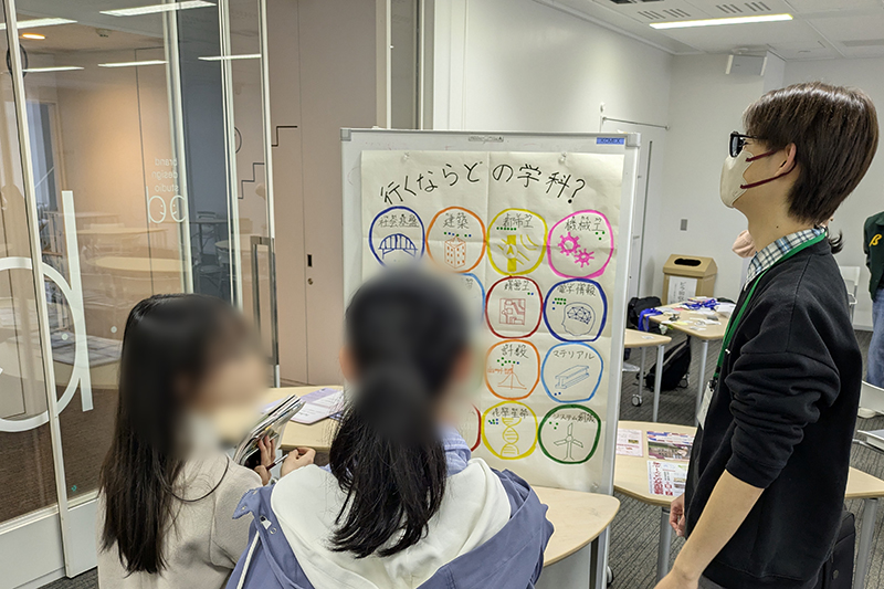 A consultation corner staffed by current engineering students was set up at the venue, where visitors could ask questions about their academic path, preparation for the entrance exams, and many other topics. Numerous questions were also asked around the poster displays, demonstrating the high level of interest amongst the visitors. Many commented that “it was great to hear directly from current students” and that “their explanations were very clear.” Having student assistants from a variety of departments and backgrounds helped increase overall visitor satisfaction. 会場には現役工学部生の学生アシスタントが常駐する相談コーナーを設け、進学選択や受験勉強を中心にさまざまな質問に対応しました。ポスター展示の周囲でも多くの質問が寄せられ、来場者の関心の高さがうかがえました。「現役学生の話を直接聞けてよかった」「丁寧に説明してもらえた」などの声が多く、さまざまな学科・背景をもつ学生アシスタントが対応したことで満足度向上につながりました。