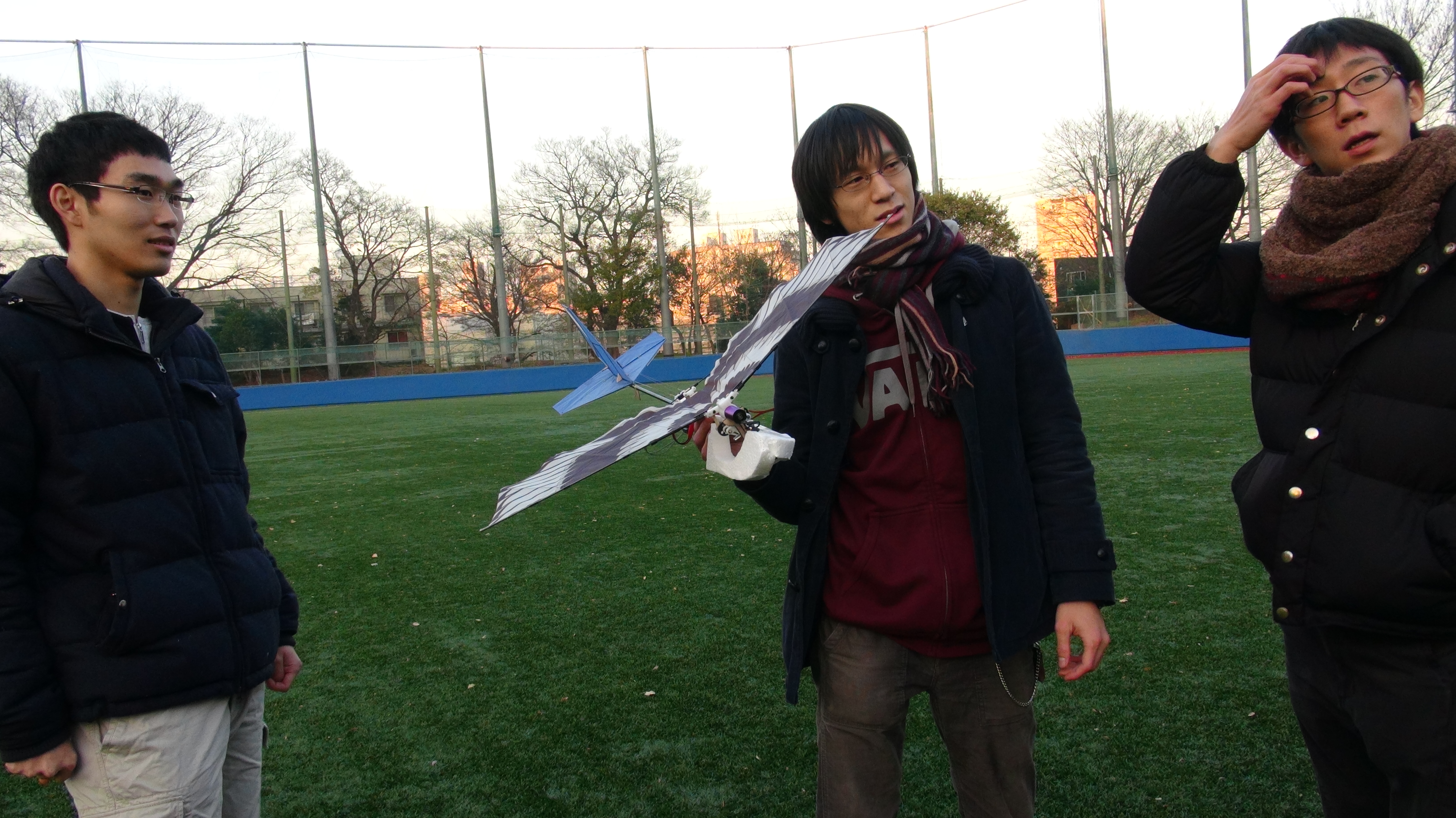 On December 24th we performed a flight test at the baseball park in Hongo campus. We mainly checked the motion of the ornithopter’s main wings and observed its flight performance. We used two sets of wings; the commercially-available ‘Cybird’ wings and the original wings made by us.
