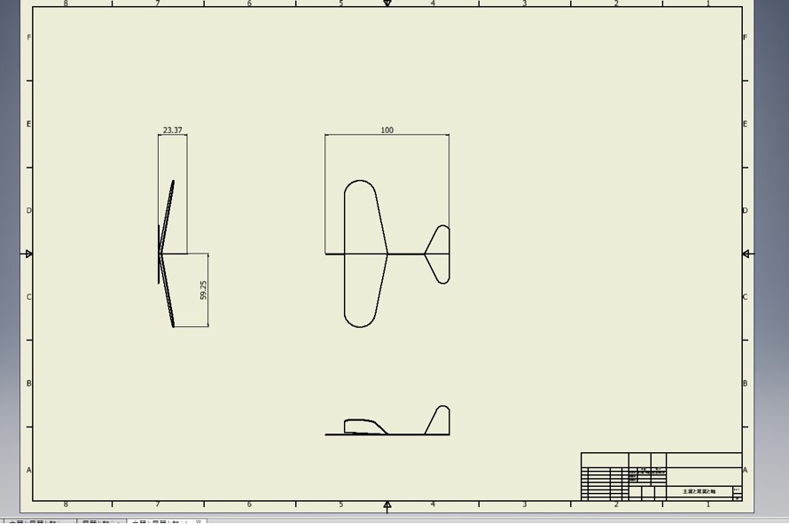 This week, we decided various elements about our airplane, and we created a 3-view drawing by using 3D-CAD. Our concept is to create an airplane like ZERO fighter. So, we made a goal which our airplane should have high gliding and high turning performance. Considering that things, our airplane should have large rudder, and large wing area. Under that conditions, we decided various information about our airplane.