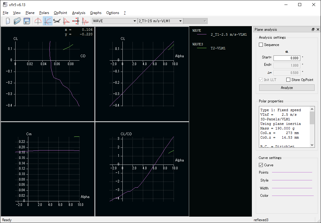 Last week we started to construct our airframe. We made a rudder of a vertical tail and two ailerons. Everyone in this team has experienced treating with balsa woods for the first time. But soon we got used to it, and after an hour we finished making a framework of our rudder and ailerons. Next, we should challenge main wings, but we had difficulty in designing main wings. Our main concept was a tailless aircraft, and we decided to use an inverted camber wing to gain vertical stability. In designing the main wing we used XFLR5 in order to calculate some of stability parameters of the aircraft wing model. First figure shows our provisional wing and next figure is one of the analysis data.